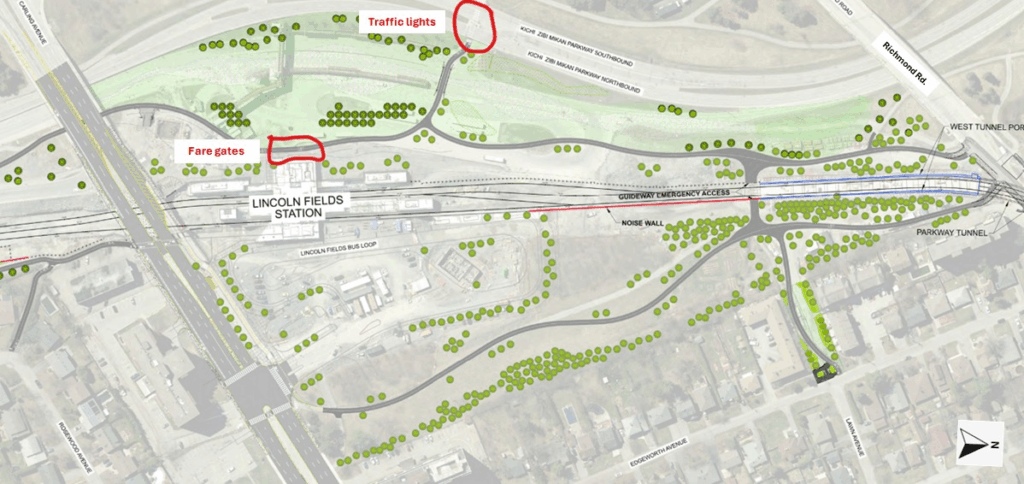 During the AGM in June 2025, a question was asked to Theresa Kavanagh (our city councillor) regarding the access to the new Lincoln Fields station for our community when it is completed. She referred the query to her office who asked the Stage 2 team for the LRT to respond. Everybody was certainly very speedy in their response, and they forwarded me the following map (see below); I’ve annotated it to include the details they communicated. It looks as though the new access will add maybe 3 to 5 minutes more to our walk from the neighbourhood